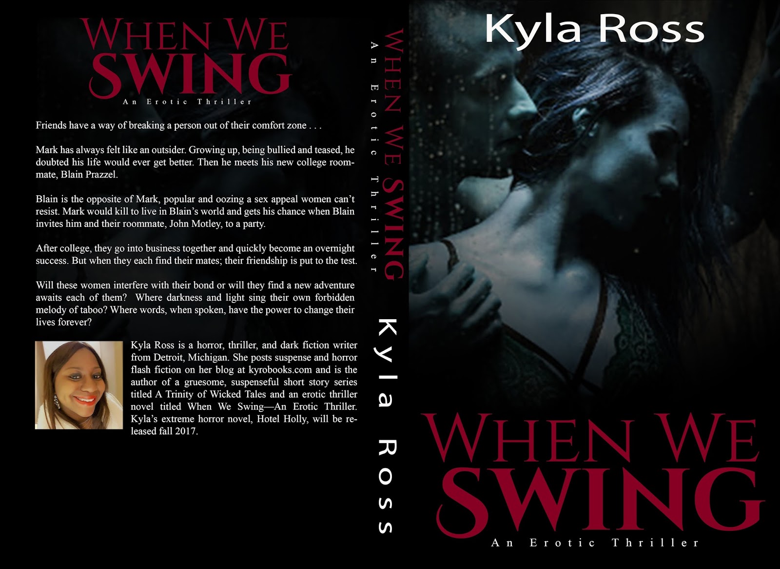 Kyla Ross is a horror, thriller, and dark fiction writer from Detroit, Michigan. She posts suspense and horror flash fiction on her blog at kyrobooks.com and is the author of a gruesome, suspenseful short story series titled A Trinity of Wicked Tales and an erotic thriller novel titled When We Swing—An Erotic Thriller. Kyla’s extreme horror novel, Hotel Holly, will be released fall 2017.
